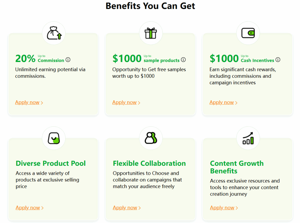 To expand its reach, Temu launched the Temu Influencer Program—its official creator partnership initiative. As a Temu Influencer, you can receive free product samples from Temu, earn up to 20% commission, and get exclusive opportunities for sponsored promotions and boosting options. Top-performing creators may also enjoy priority access to exposure on official Temu channels. Moreover, the program includes a secondary referral system that rewards creators for inviting others to join.